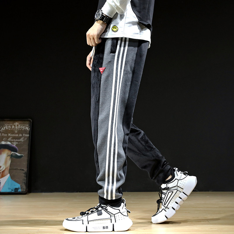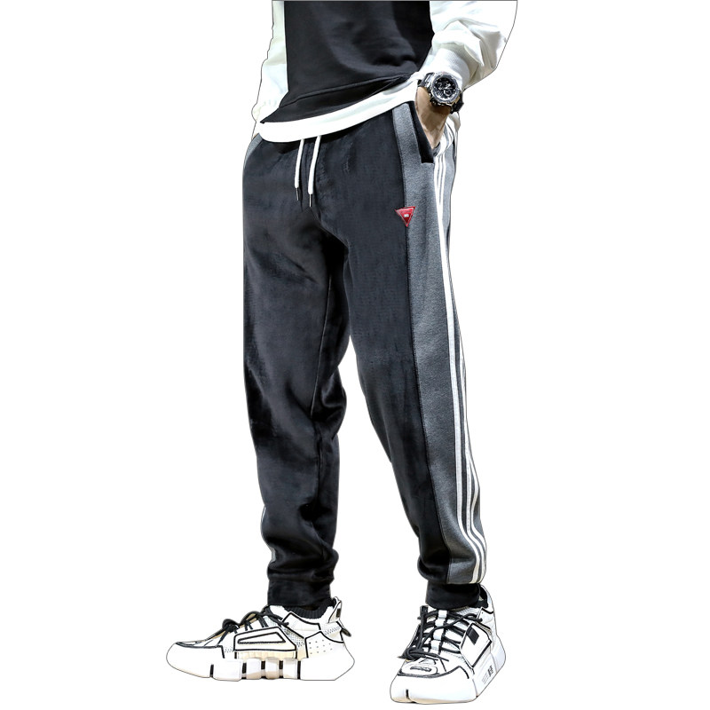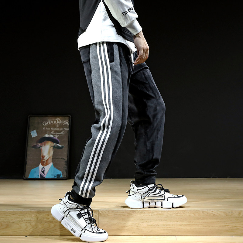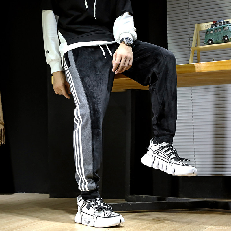 Three bars sports pants men's autumn and winter large size loose velvet thickened gold velvet casual stretch pants three bars