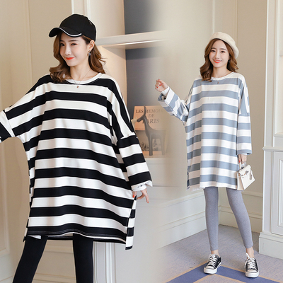 Oversized size pregnant women's necropolis dress women's spring and autumn medium long version Fat mm stripes loose long sleeve blouse tide 200 catty
