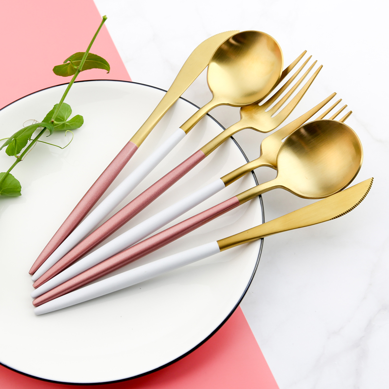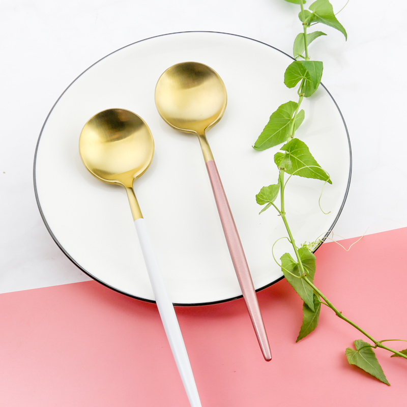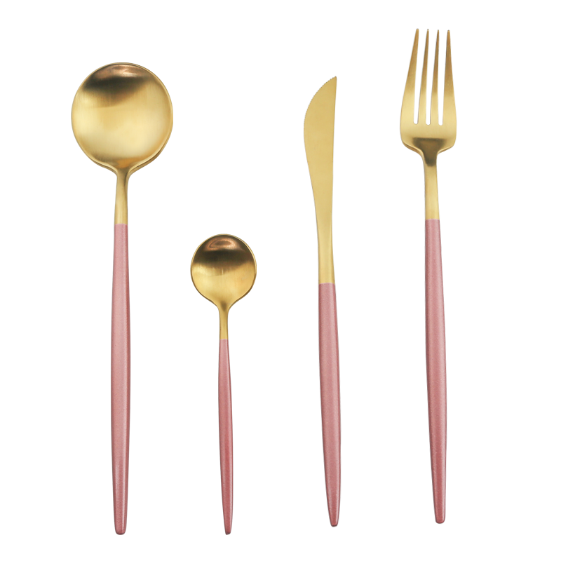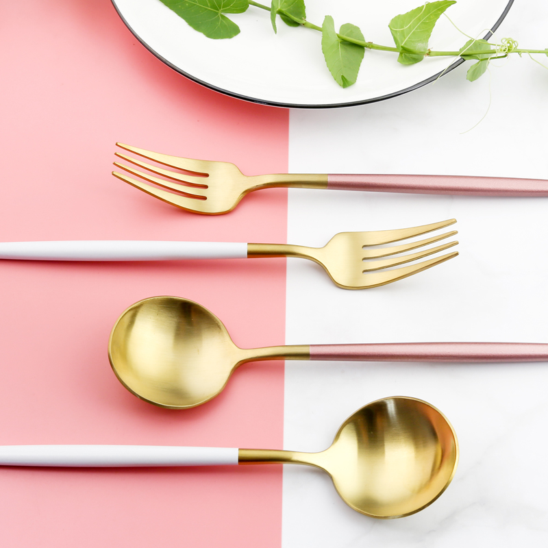 White gold tablespoon small spoon white gold main spoon white gold main knife white gold main fork pink gold spoon pink gold main spoon powder gold main knife powder gold main fork
