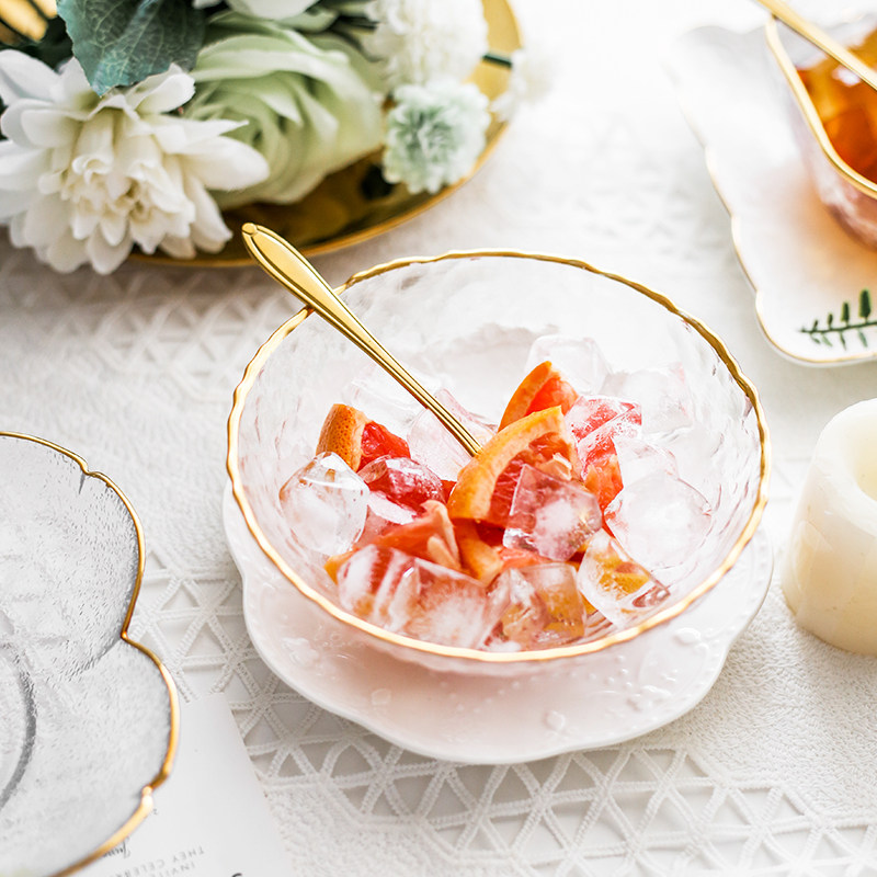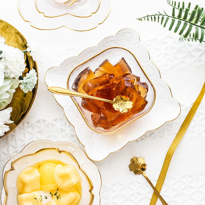 Phnom Penh glass cherry bowl disc gold spoon Phnom Penh ice flower small round bowl Disc Gold spoon Phnom Penh cone pattern small square bowl Square plate Gold spoon Phnom Penh Glass Cherry Bowl Gold disc Gold spoon Phnom Penh ice flower small round bowl