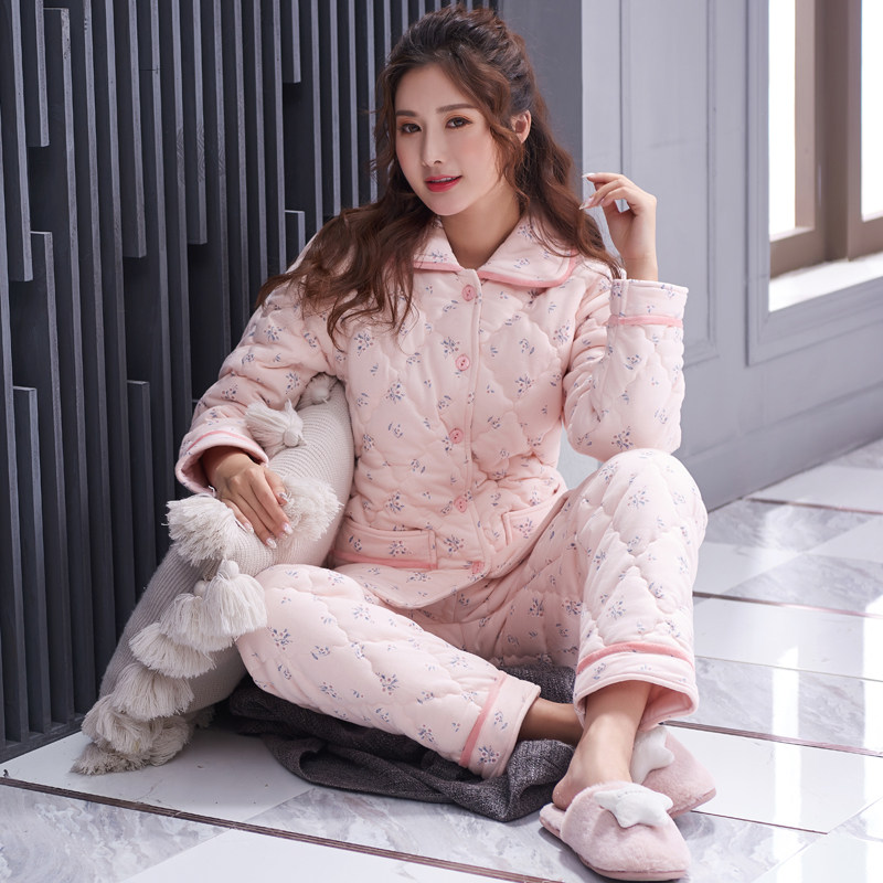 Pajamas Woman Autumn Winter Pure Cotton Thickened Triple Clip Cotton Warm Large Size size All cotton extras outside Broken Florist Home Suit Suit