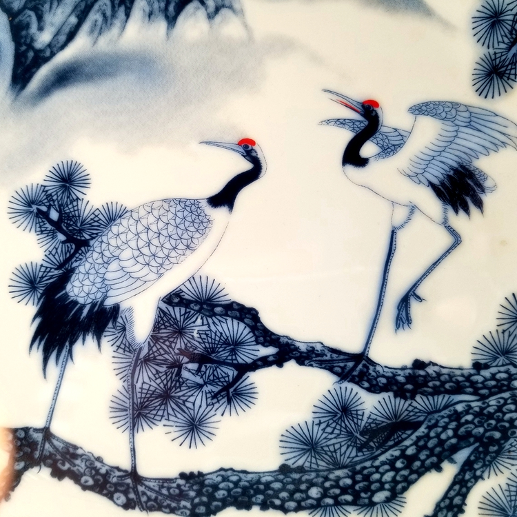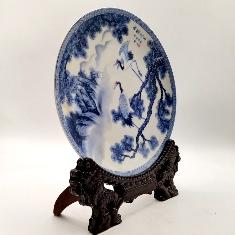Qingqianlong blue and white pine crane Yannian porcelain plate home placement porch living room decoration decorations antique style water plate