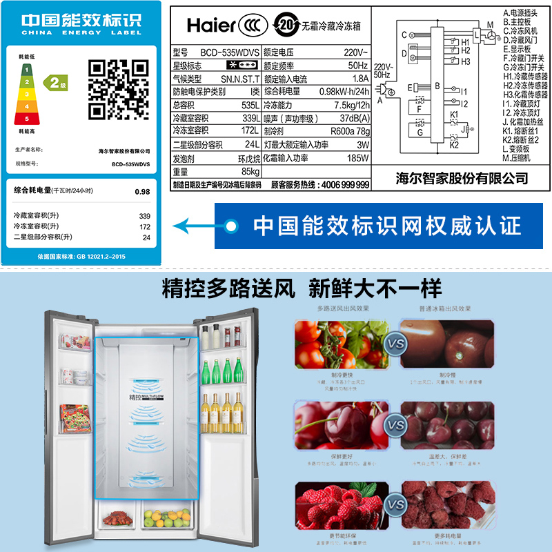 Haier 535L large-capacity double-door split door inverter energy-saving air-cooled, frost-free healthy fresh-keeping household refrigerator