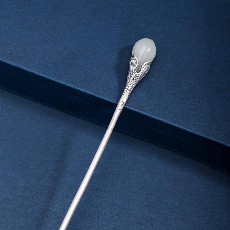 Hangtian Yuka Ha Ha Antiochu S925 Silver Antique style clothing with simple white jade ball head classical jade blossom