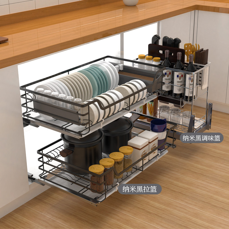 Hydes La Basket Kitchen Cabinet 304 stainless steel double drawer type damping dishes bowl basket bowl basket storage seasoning