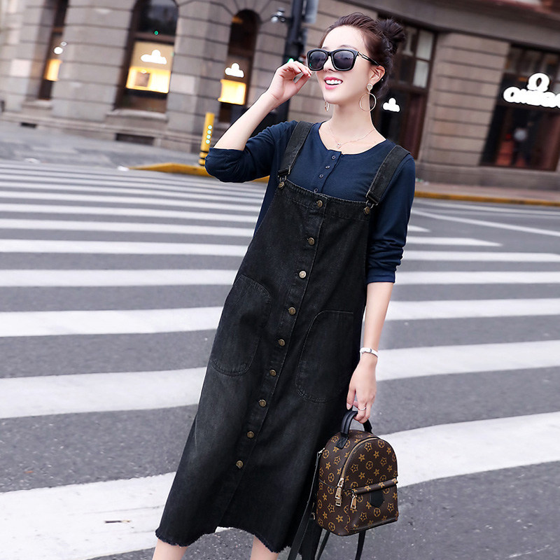 2021 spring and autumn new Korean version baby bag denim dress women's suspenders slimming single-breasted a-line mid-length skirt