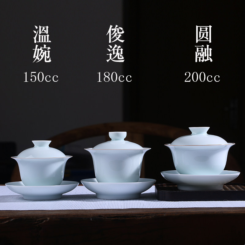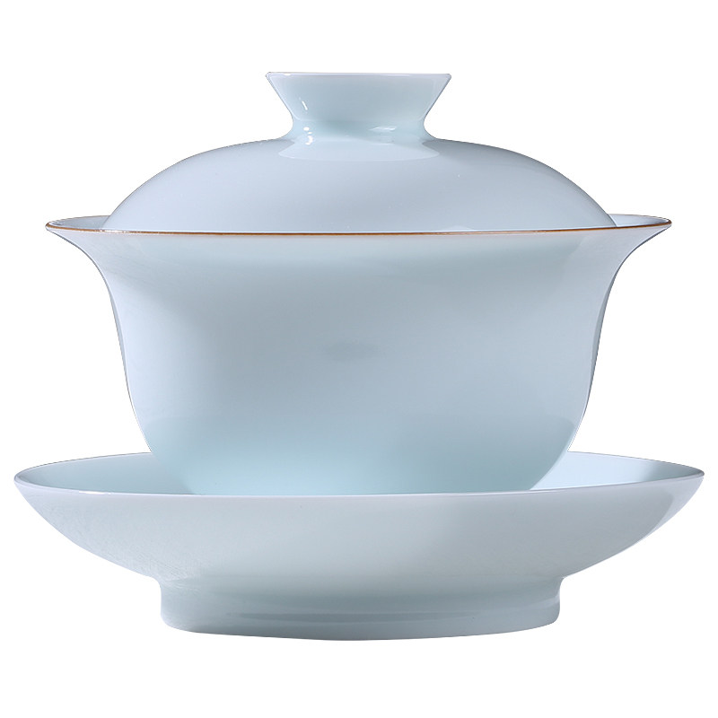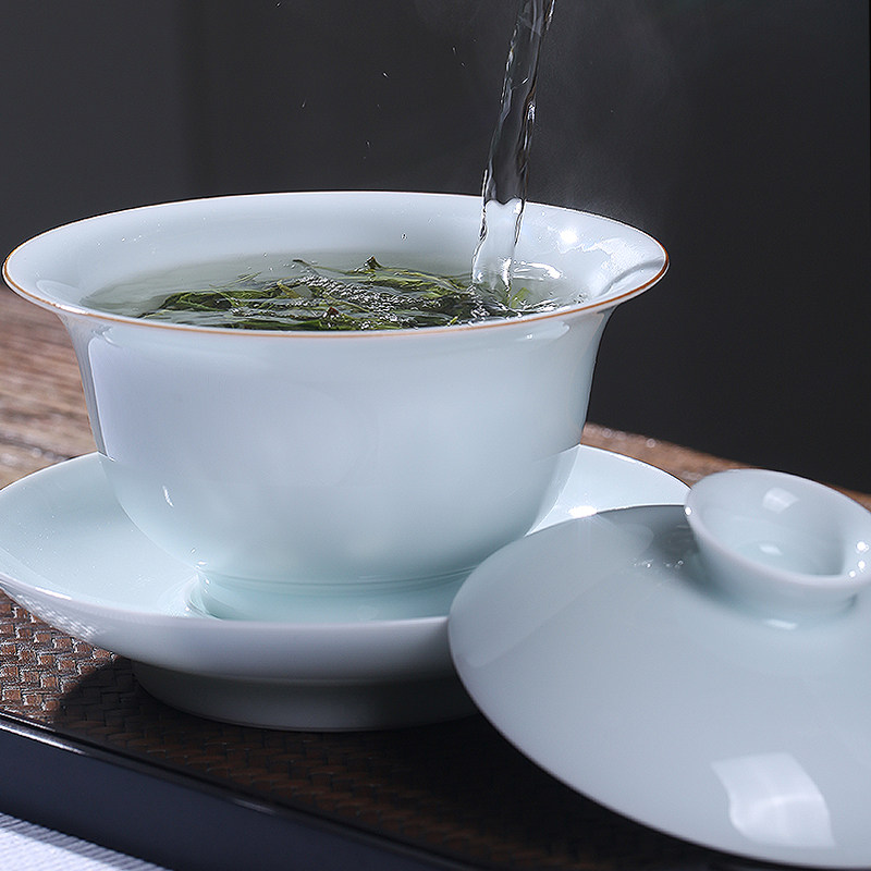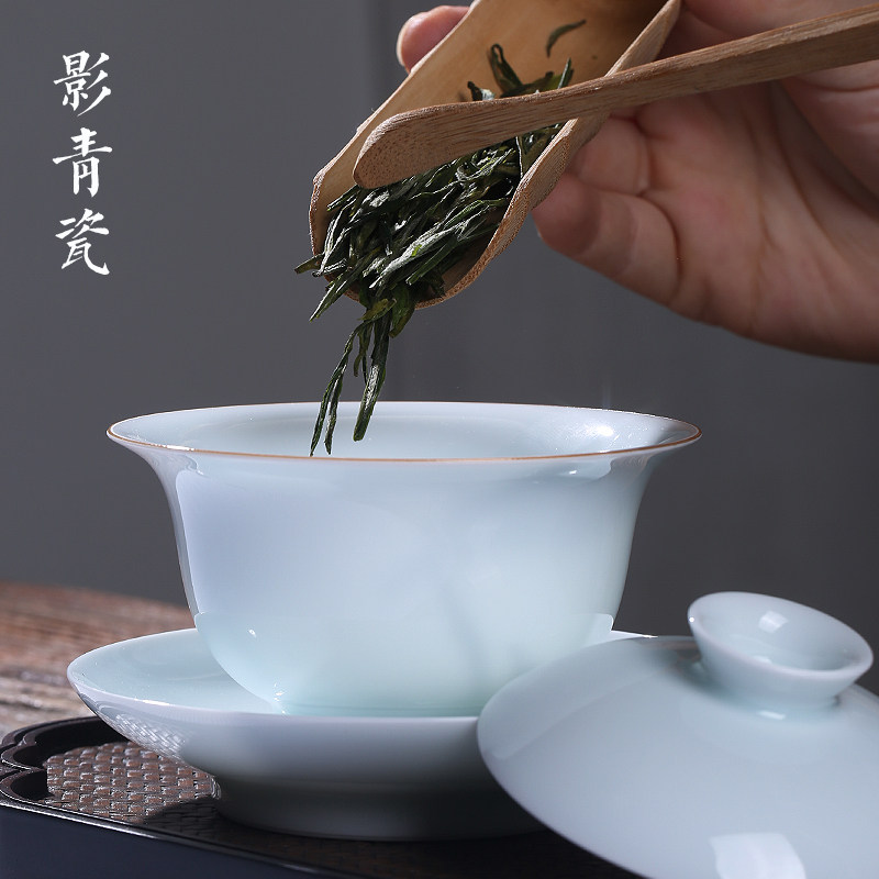 Sanlu Jingdezhen gai bowl teacup pure handmade Hutian shadow celadon sancai cup bubble tea bowl blue and white porcelain kung fu tea set