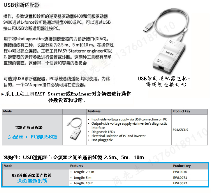 Lenze Usb Diagnostic Adapter E94AZCUS Lenze USB Diagnostic Adapter New