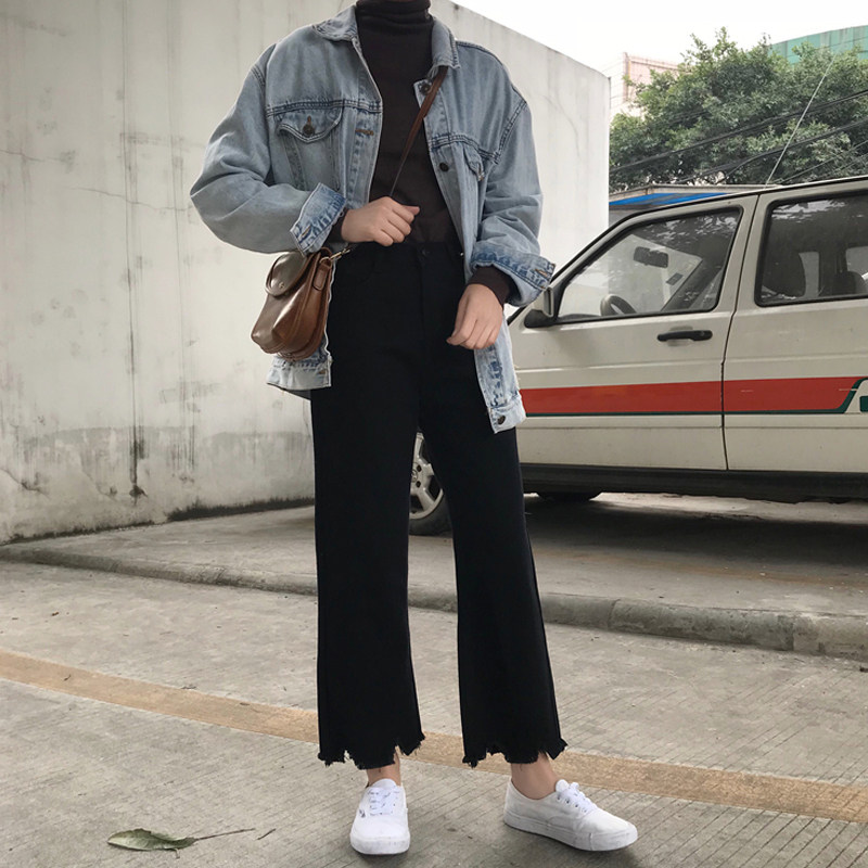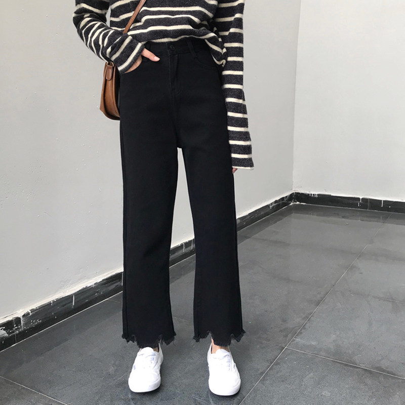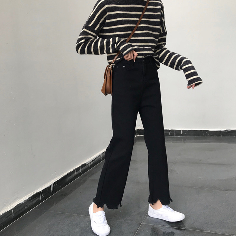 Big size jeans female fat mm loose straight pants 200 pounds fat sister spring high waist nine-point pants wide leg pants