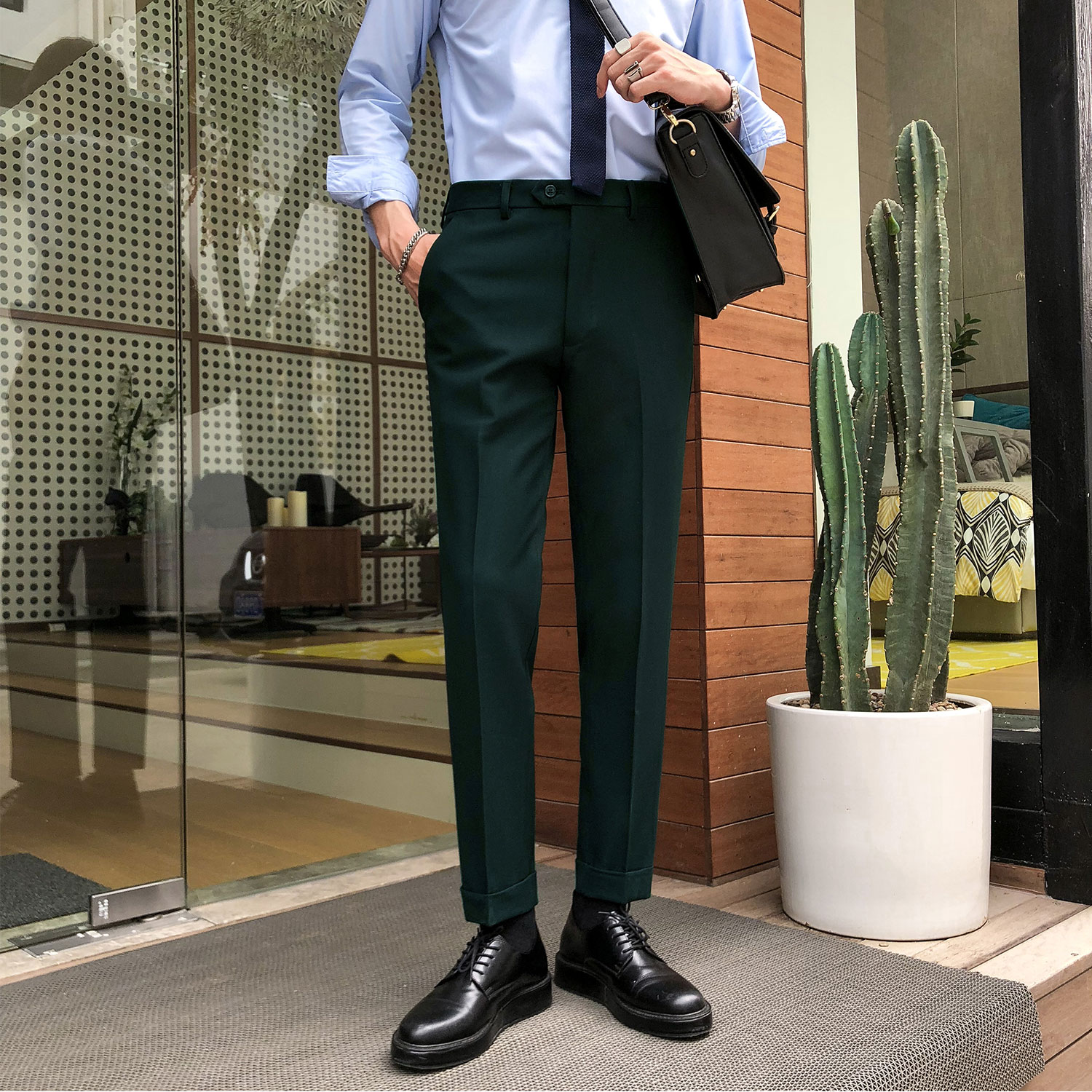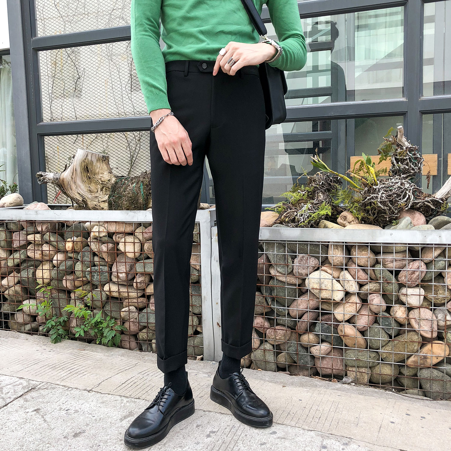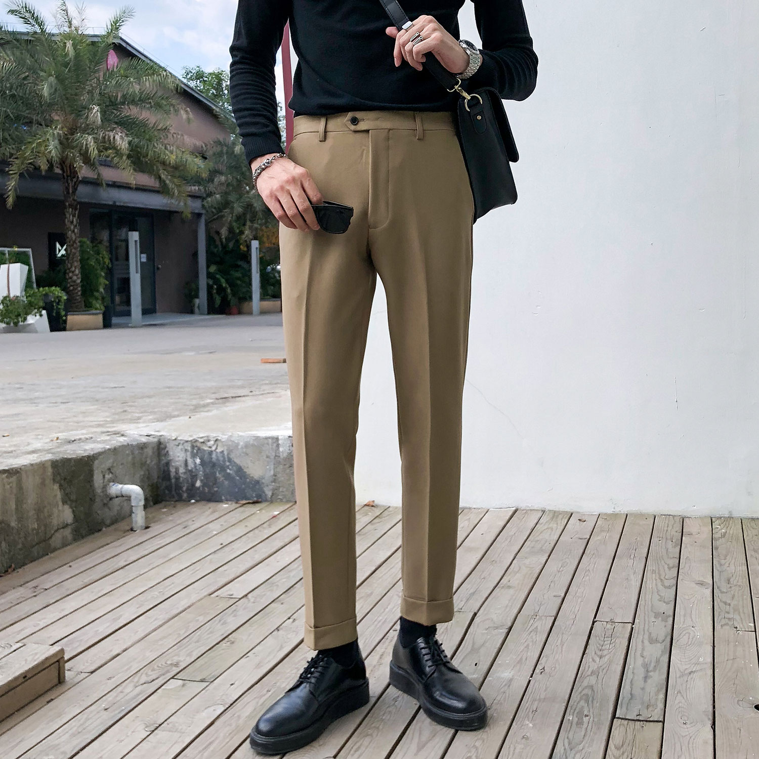 Autumn micro-elastic trousers men's British retro casual suit pants Korean slim straight hemmed trousers free ironing tide