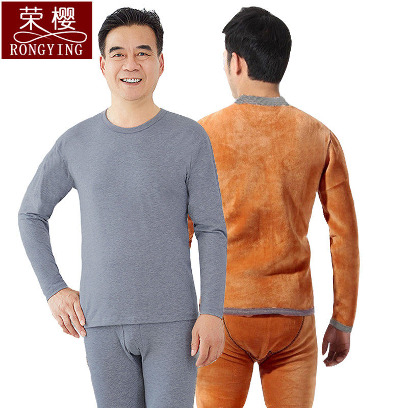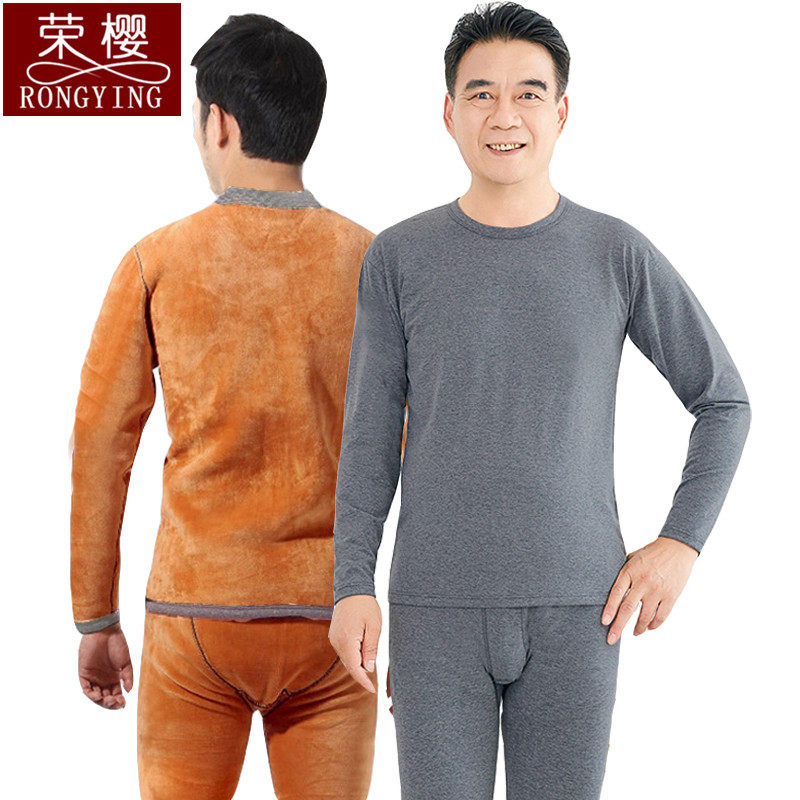 Men's round collar warm underwear thickening plus pure cotton middle and elderly autumn sweater pants add gold warm armor suit