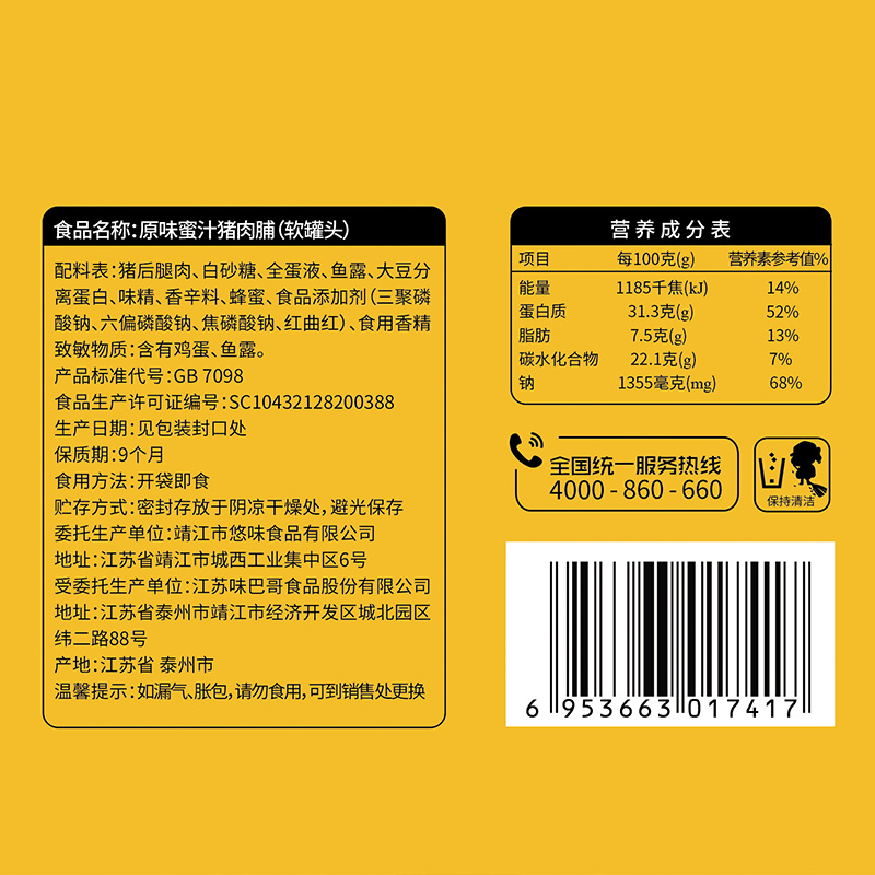 Pork hind leg meat White sugar Whole egg liquid Fish sauce Soy protein isolate Monosodium glutamate Teriyaki sauce Spices Honey flavor