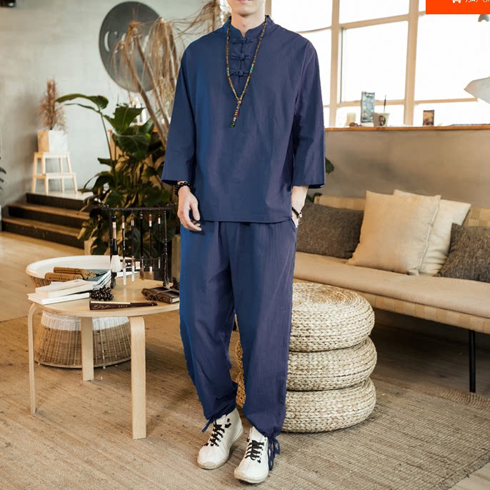 Chinese style men's clothing Tang clothing Han clothing Youth retro style linen suit Cotton and hemp buckle National style lay clothes Zen clothes