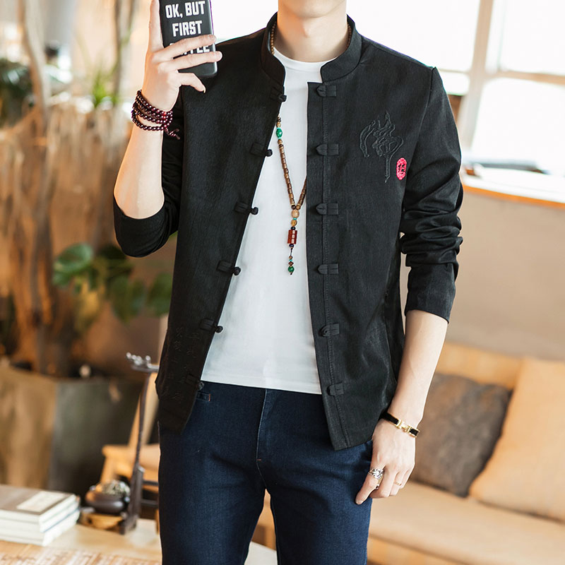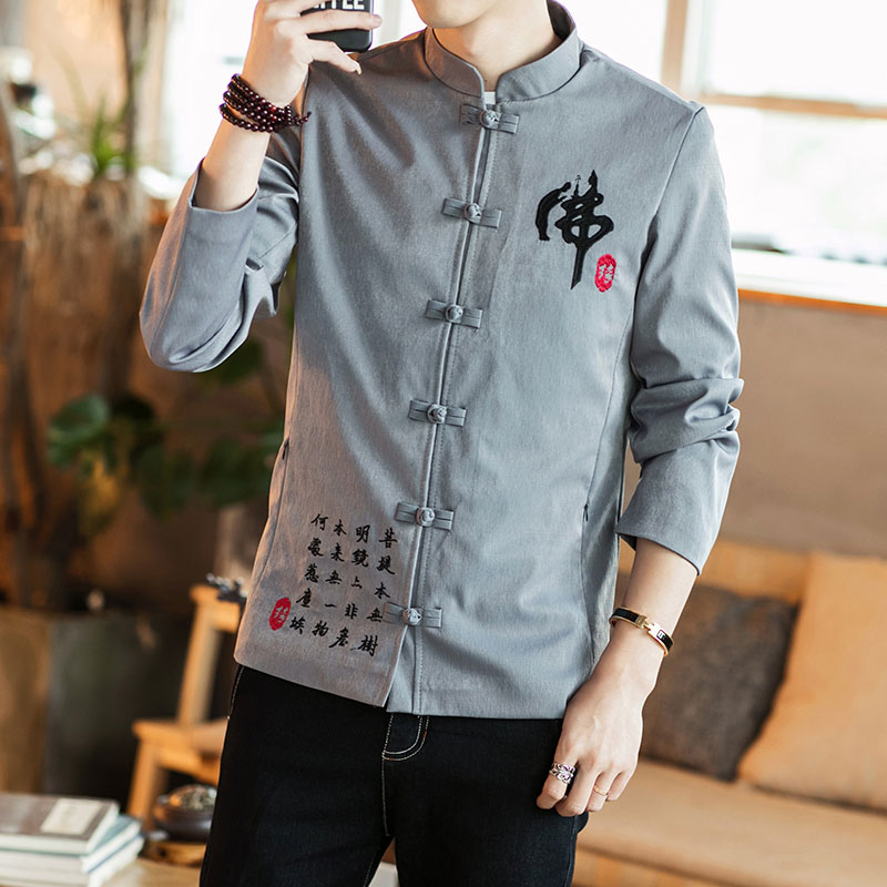 Spring new Chinese style jacket men's Tang dress Chinese jacket Buddha youth casual stand-up collar embroidery top men
