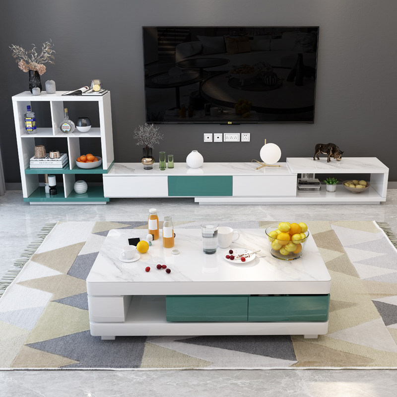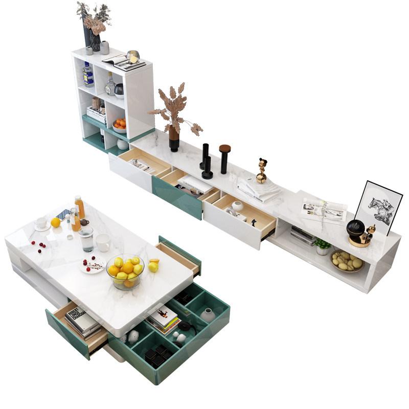 Nordic Wind Parquet Coloured Rock Plate TV Cabinet Tea Table Dining Table And Chairs Combination Suit Living Room Modern Minima Telescopic Small Family
