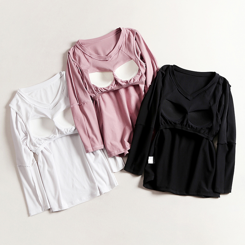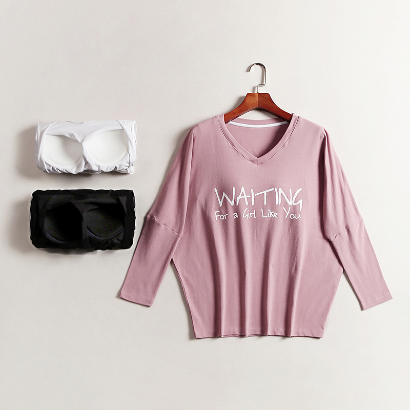 Pure cotton with chest pad long-sleeved T-shirt women's autumn and winter loose bottoming shirt bra cup integrated bat shirt outerwear top