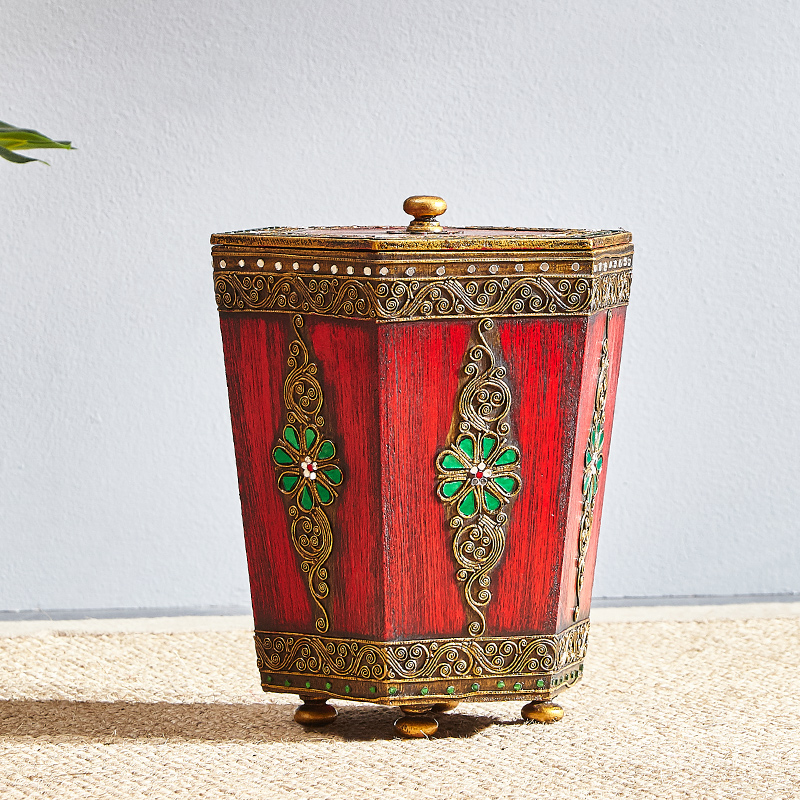 Thailand Southeast Asian wood carving garbage can with cover Thai spa massage shop living room kitchen home carved storage bucket