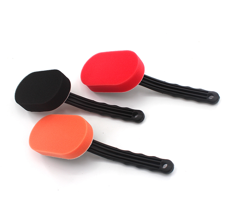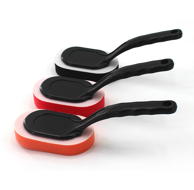 Five black sponges five red sponges five orange sponge long handle brushed black sponge long handle brushed the red sponge long handle brushed the orange sponge long handle brushed.