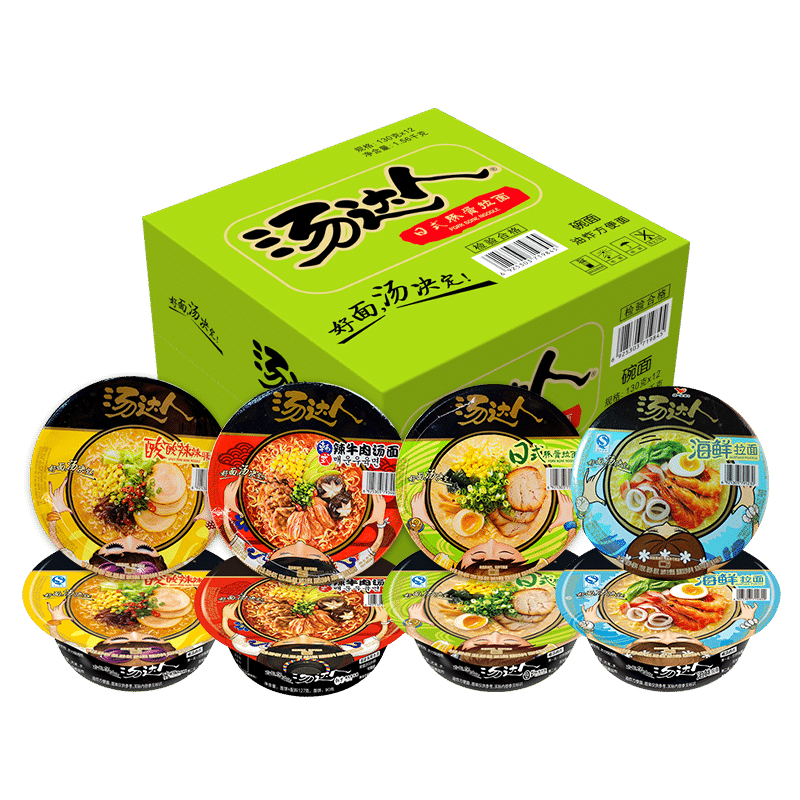 Mix and match 12 bowls (optional flavor) (Green) Japanese Tonkotsu Noodles 12 bowls (yellow) Sour and spicy Tonkotsu noodles 12 bowls (Red) Korean spicy beef 12 bowls (blue) Seafood pull