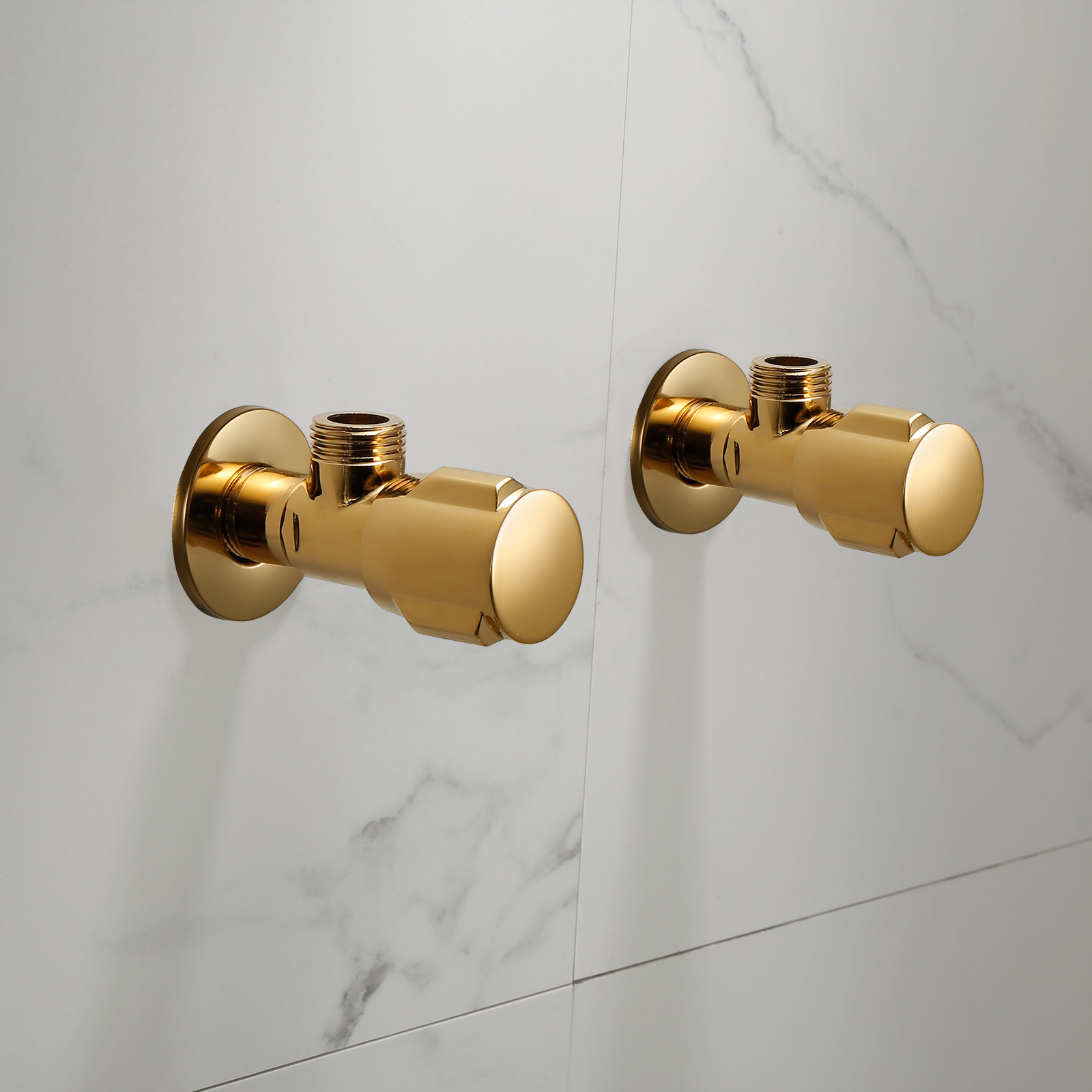 A golden angle valve A pair of golden angle valves A silver angle valve A pair of silver angle valves