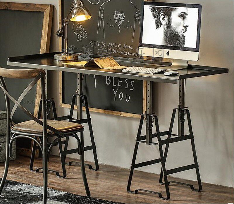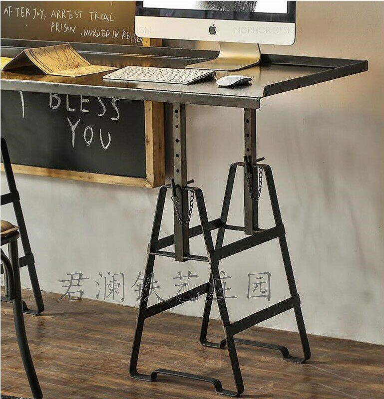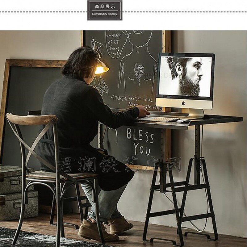American country retro old style computer table and chair wrought iron back chair industrial desk chair iron plate solid wood dining chair