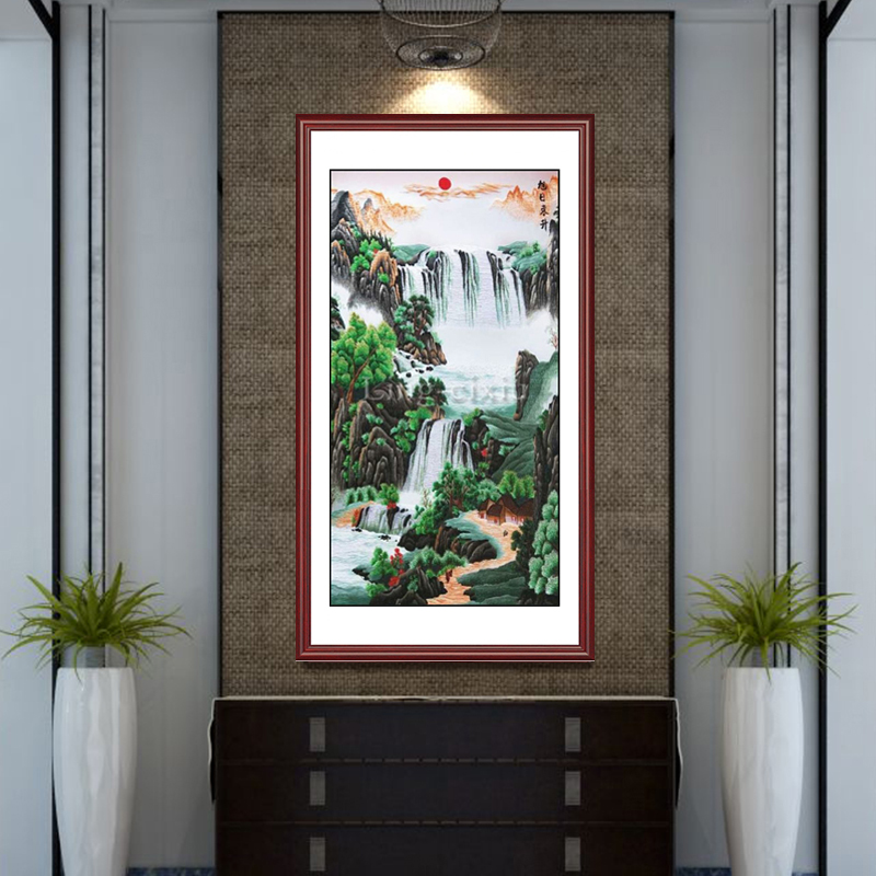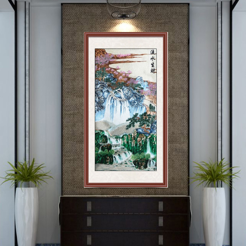 Su embroidery finished vertical version Xuanguan decoration painting true silk embroidery imitation handmade solid wood with frame living room finished landscape painting