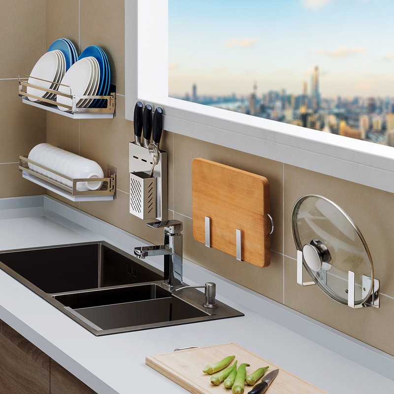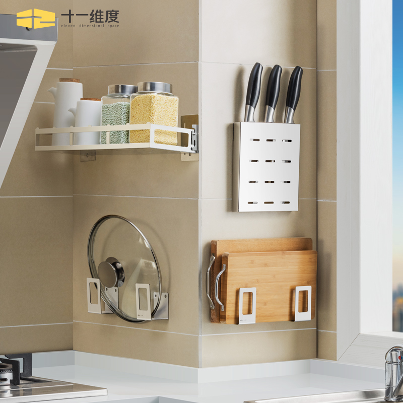 Chopping board rack (punching without punching for double use) pot cover rack (punching without punching for double use) knife rack (punching without punching for double use) send 3 hooks 2 in 1 chopstick barrel seasoning can rack (punching for double use)