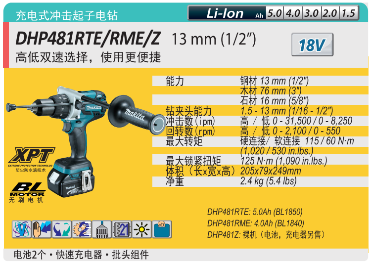 DHP481RME (2 electric 1 charge 4 0AH) DH481RTE (2 electric 1 charge 5 0AH) DHP481Z (bare metal)