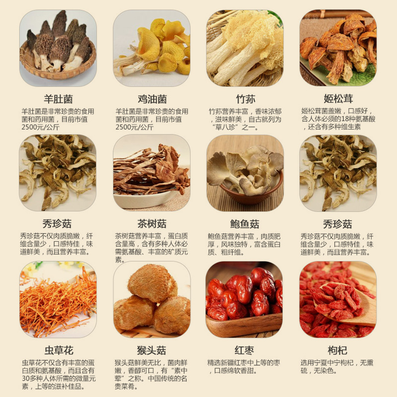 Yunnan specialty wild fungi Dry food combination Bamboo fungus Morel porcini mushroom Colorful mushroom soup package soup ingredients