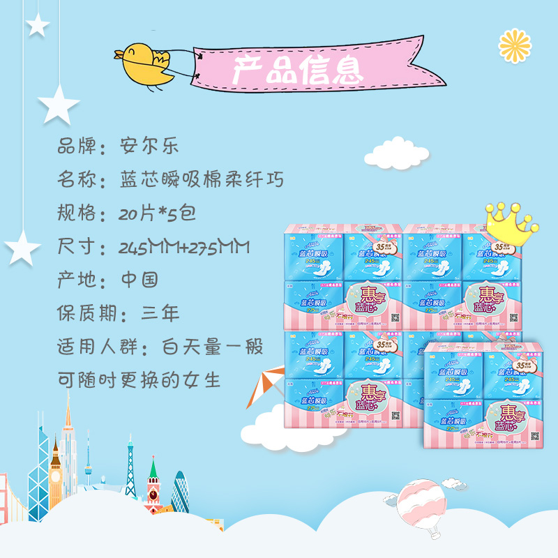 Anerle flagship store sanitary napkin blue core instant sucking aunt towel soft cotton day and night combination 100 pieces of whole box