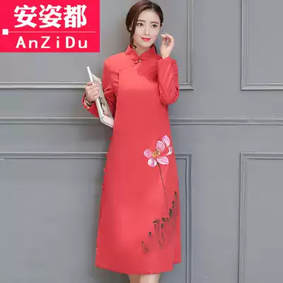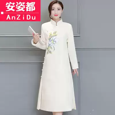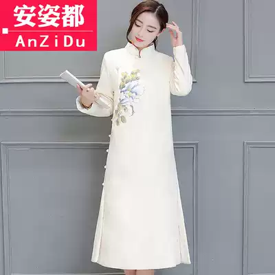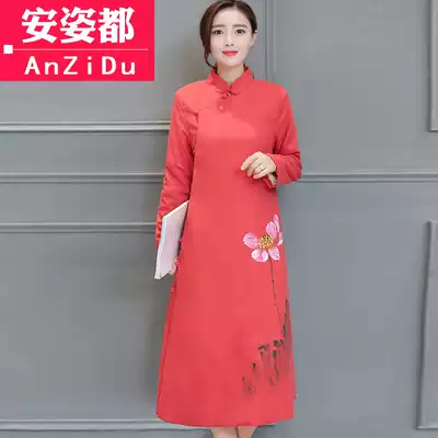 Cheongsam winter padded lint cotton linen dress women's long sleeve long autumn winter dress Chinese style improved cheongsam skirt