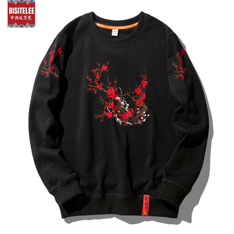 Round neck pullover plus fleece thick cotton T men's tide embroidery autumn and winter new warm hatless size loose couple clothes