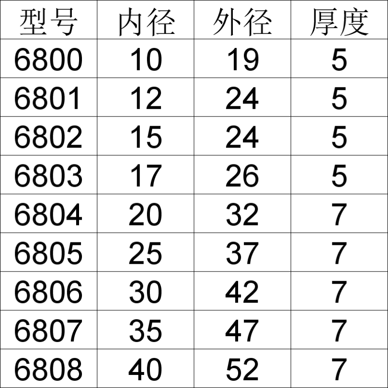 6800ZZ(inside 10 and 19 thick 5)6801ZZ(inside 12 outside 21 thick 5)6802ZZ(inside 15 outside 24 thick 5)6803ZZ(inside 17 outside 2