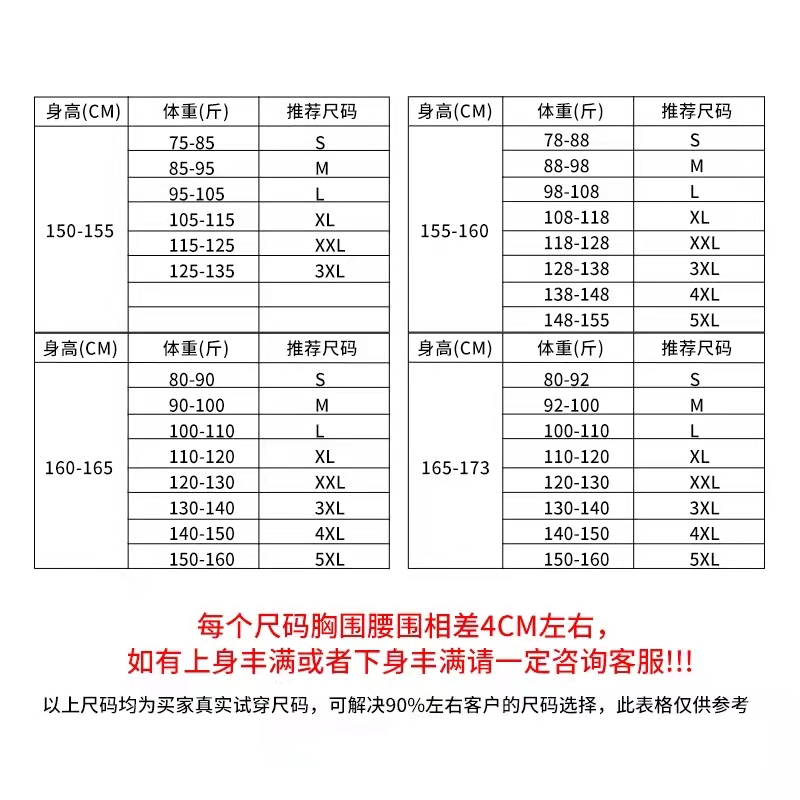 S (within 90 jins) M (91 jins-100 jins) L (101 jins-110 jins) XL (111 jins-120 jins) XXL (121 jins-130 jins) XX