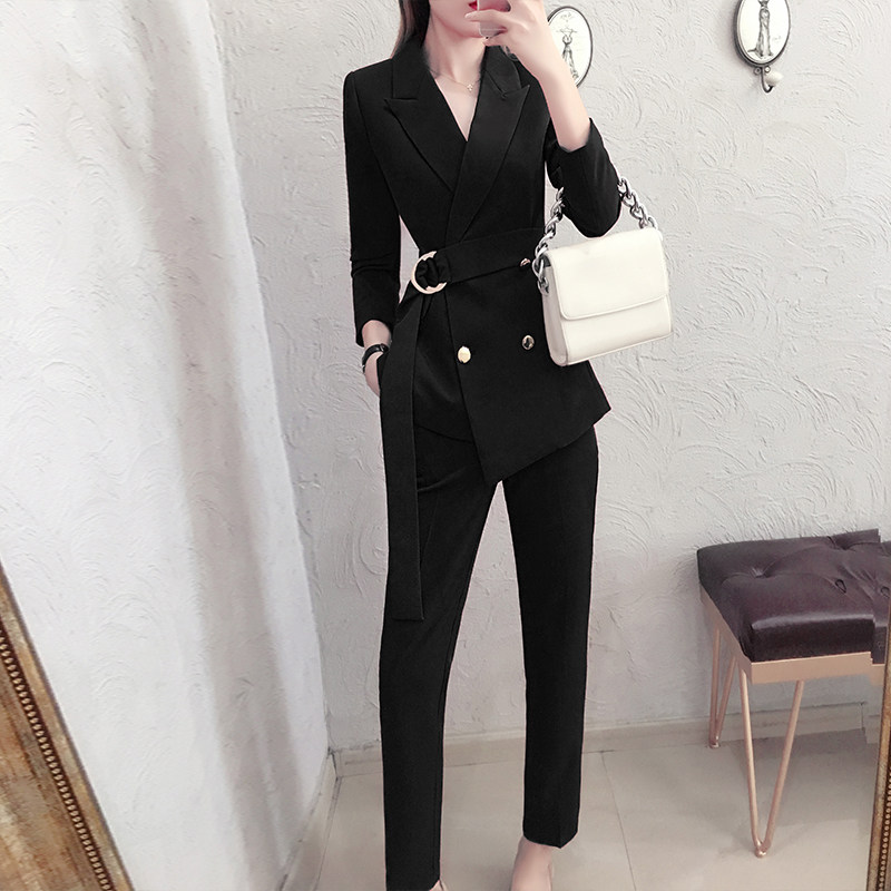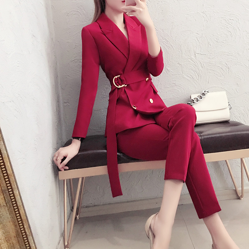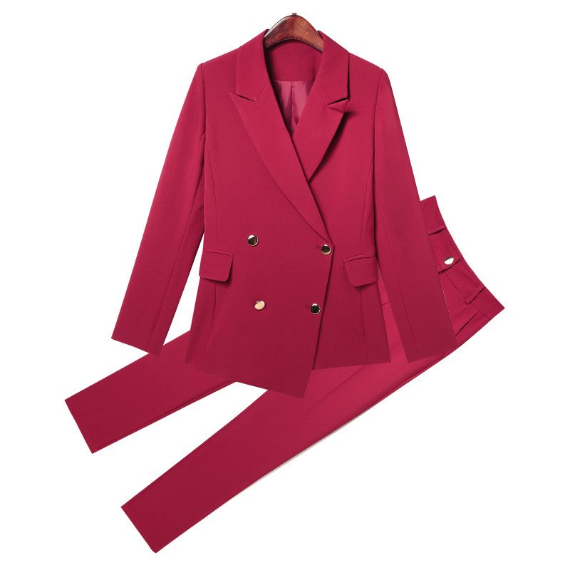 Spring Fall Dark Red Suit Suit Women Fashion Work Clothes Temperament goddess Fan is wearing two sets of foreign pants