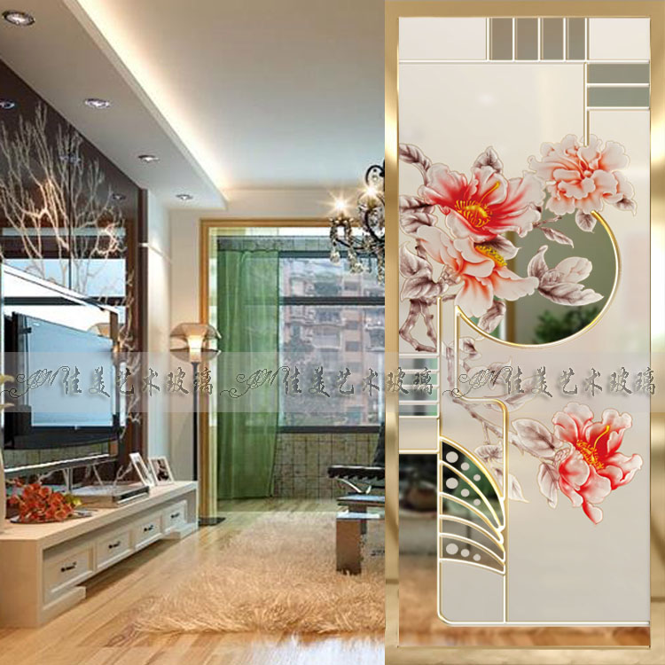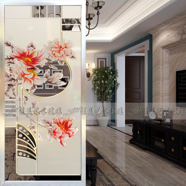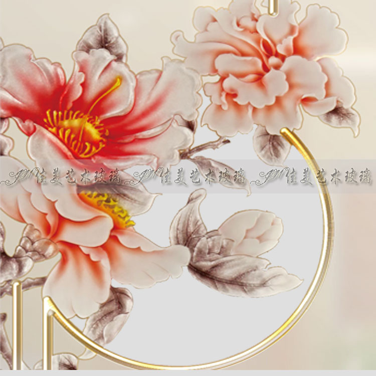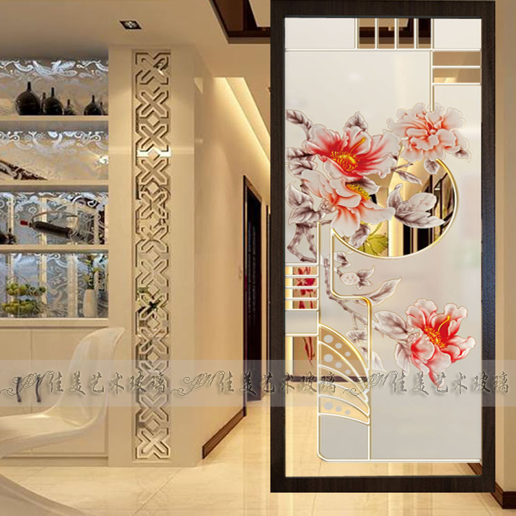 Custom art glass living room screen partition porch cabinet background wall carving process tempered peony flower