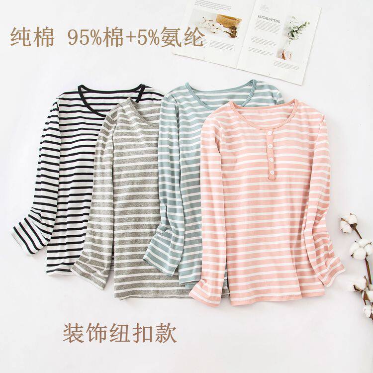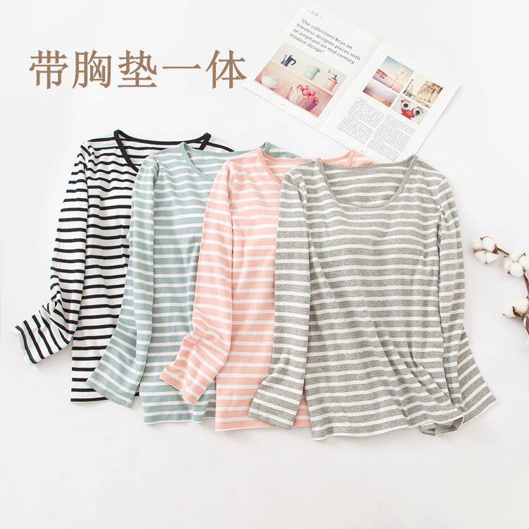 Long-sleeved T-shirt with chest pads, pure cotton, no bra, no rims, cups, stripes, yoga underwear, pajamas, bottoming shirts
