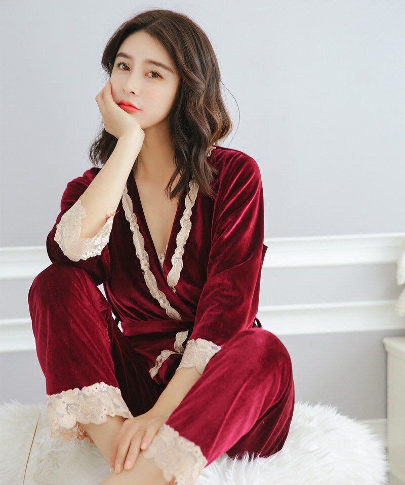 Japan autumn and winter velvet sexy pajamas women's suit condole belt nightgown golden velvet pajamas three-piece home dress women