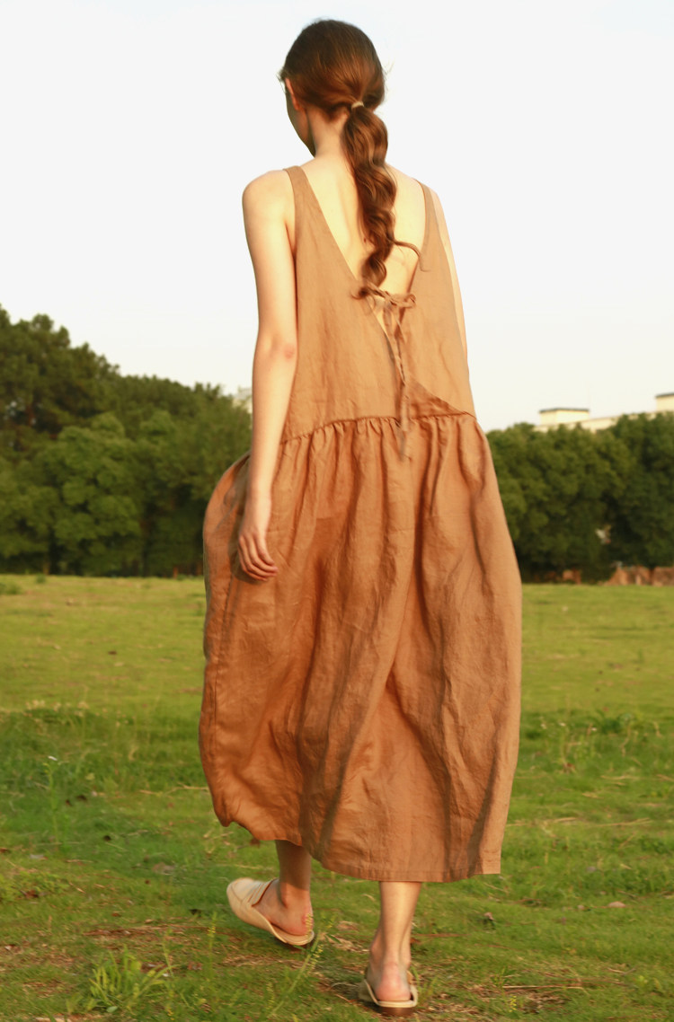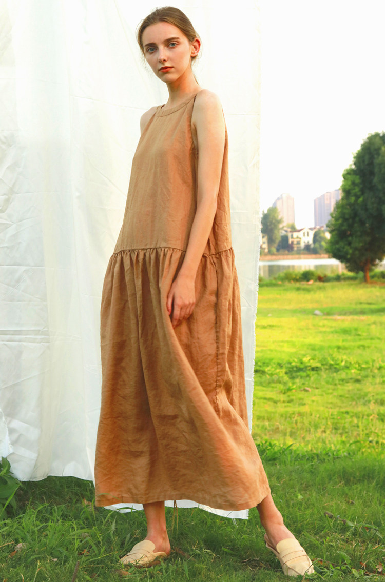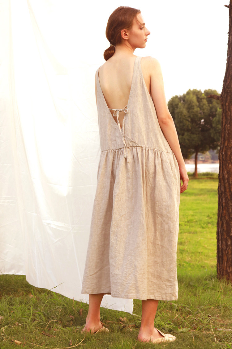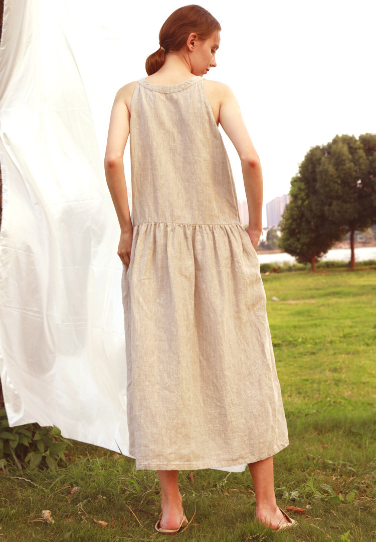 Chen Xiaoman linen dress Over-the-knee long version of skin-friendly soft sleeveless backless night dress Casual style daily household clothes