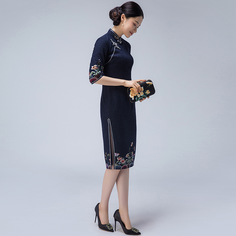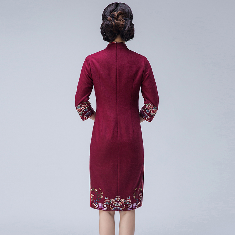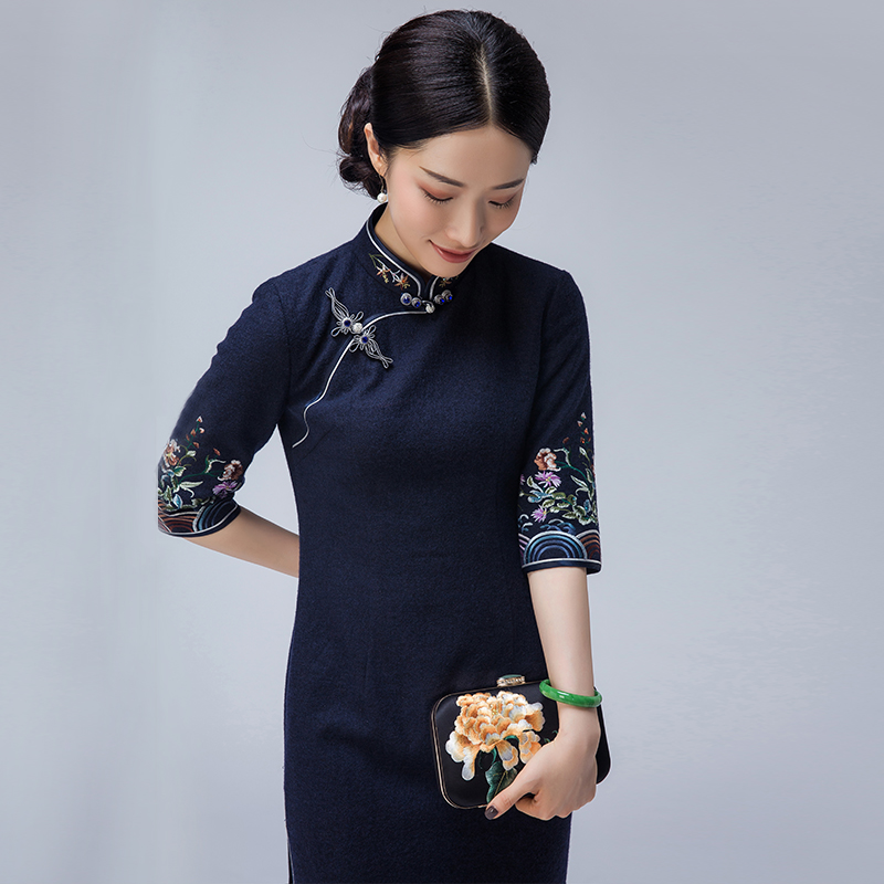 Cheongsam autumn and winter 2021 new dignified atmosphere Republic of China wind wool embroidery three-point sleeve modified dress for women