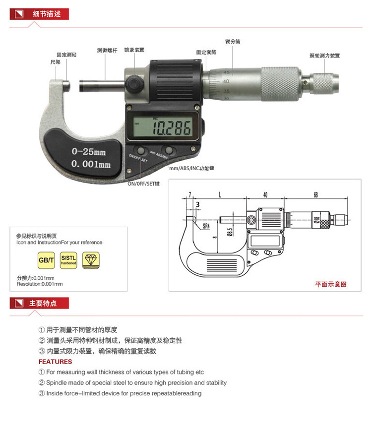 Guilin Guanglu hemispheric head tube wall digital micrometer wall thickness single ball head double ball head 0 001 micron micrometer