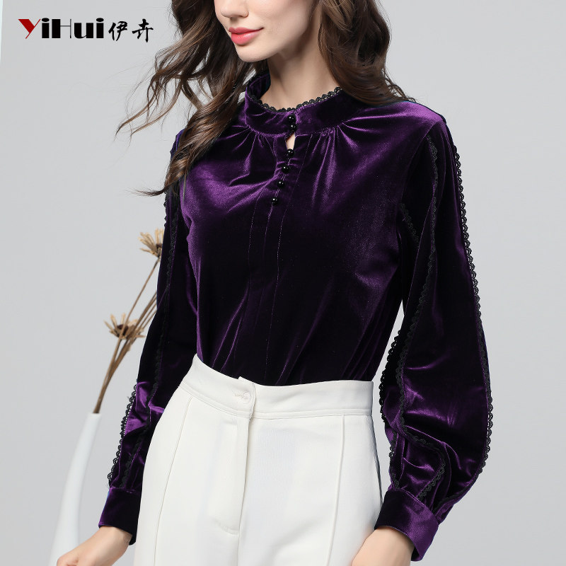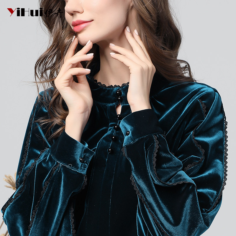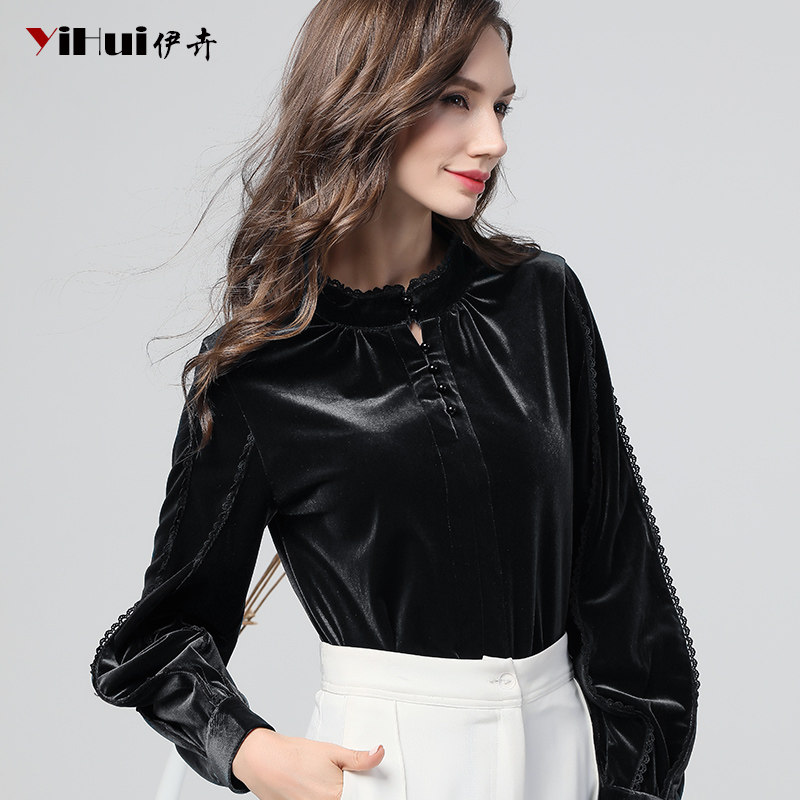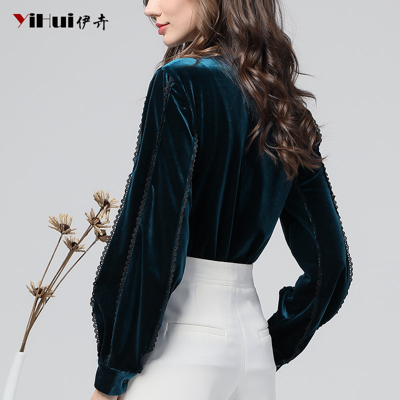 Autumn new velvet top women's shirt beaded lace lantern long-sleeved inner jacket thin and thick in autumn and winter