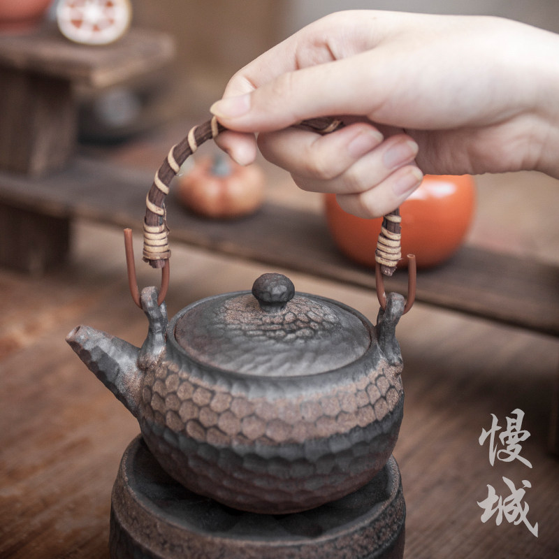 Hand-made beam pot Antique coarse pottery hammer pattern cooking teapot Kettle Pu'er tea single pot Small Japanese Kung Fu Tea set