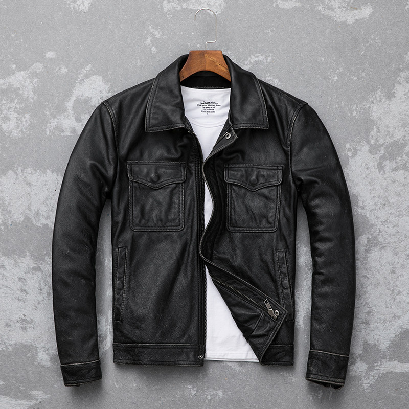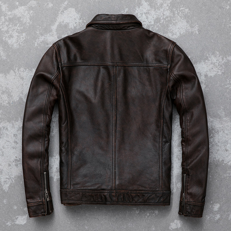 First layer cowhide vintage old leather leather men's short slim biker jacket Large size lapel men's sale