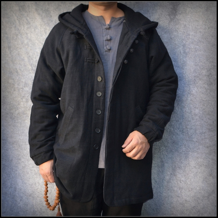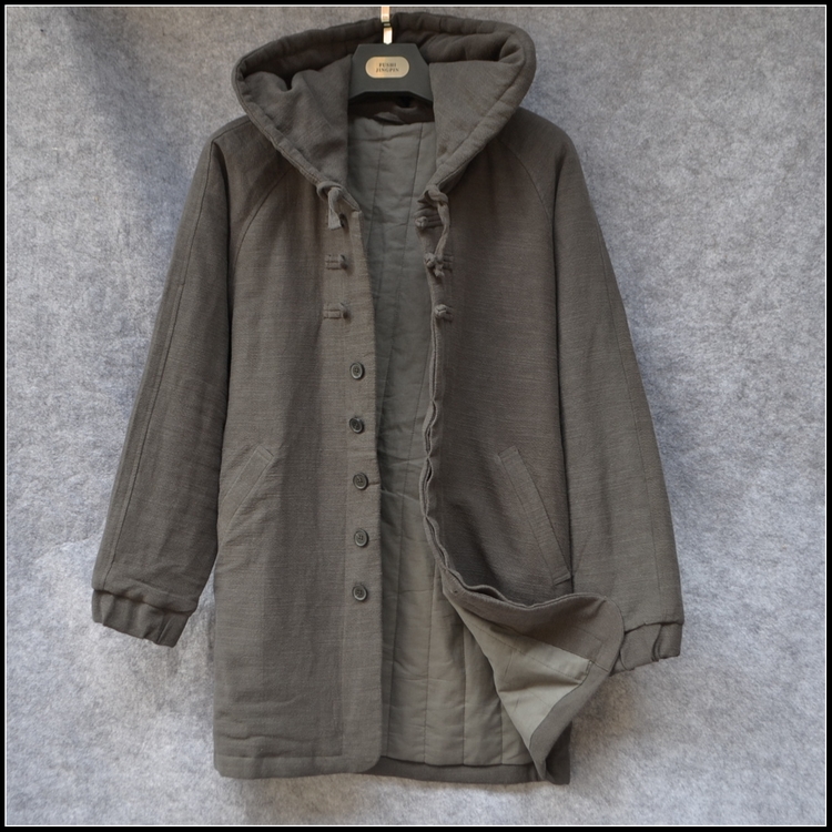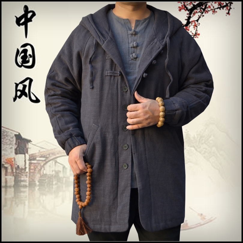 Chinese style linen men's medium and long version of cotton coat thickened jacket hooded retro Tang coat top Dad winter quilted jacket