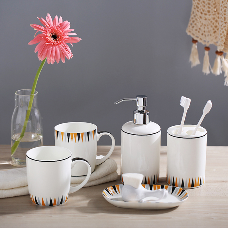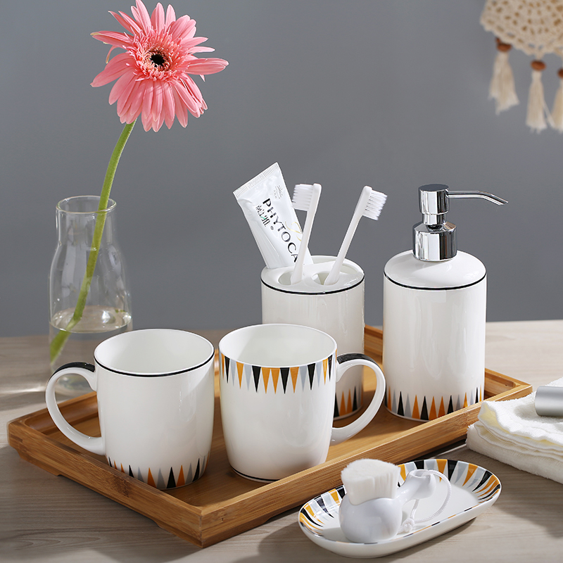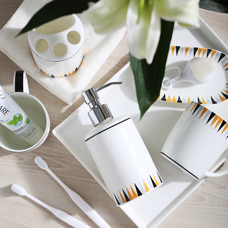 Geometric bathroom 5-piece set Geometric bathroom 5-piece set Wooden plate geometric bathroom 5-piece set Porcelain plate geometric single cup (below) Geometric lotion bottle medium tray (32x14CM) Small tray (25