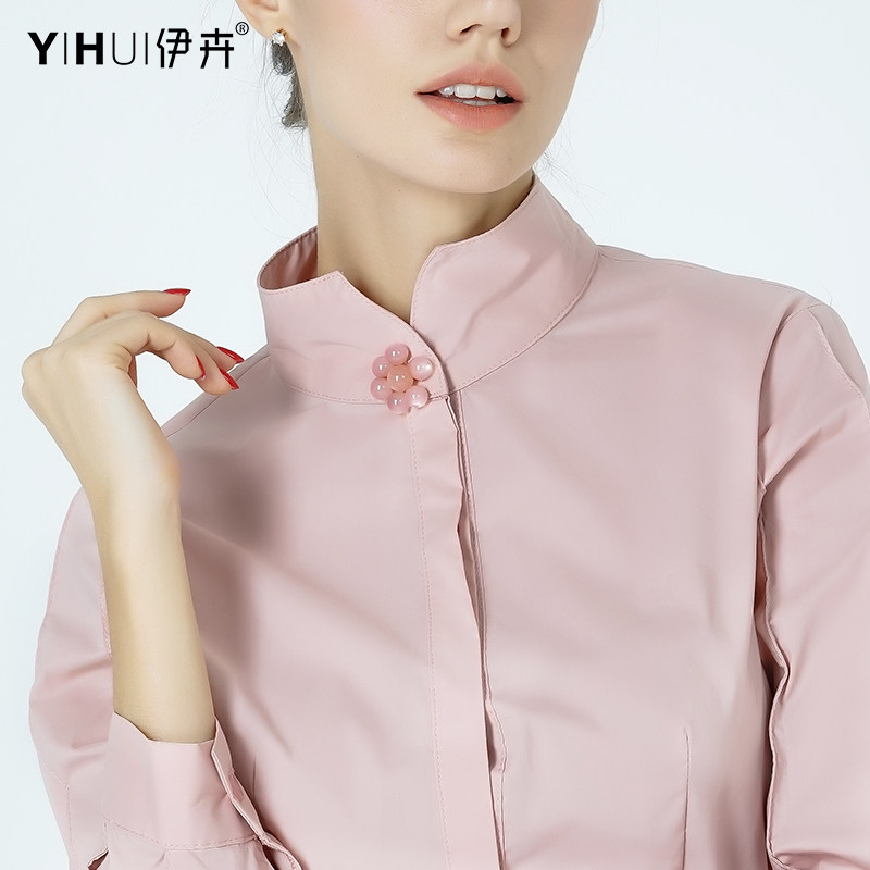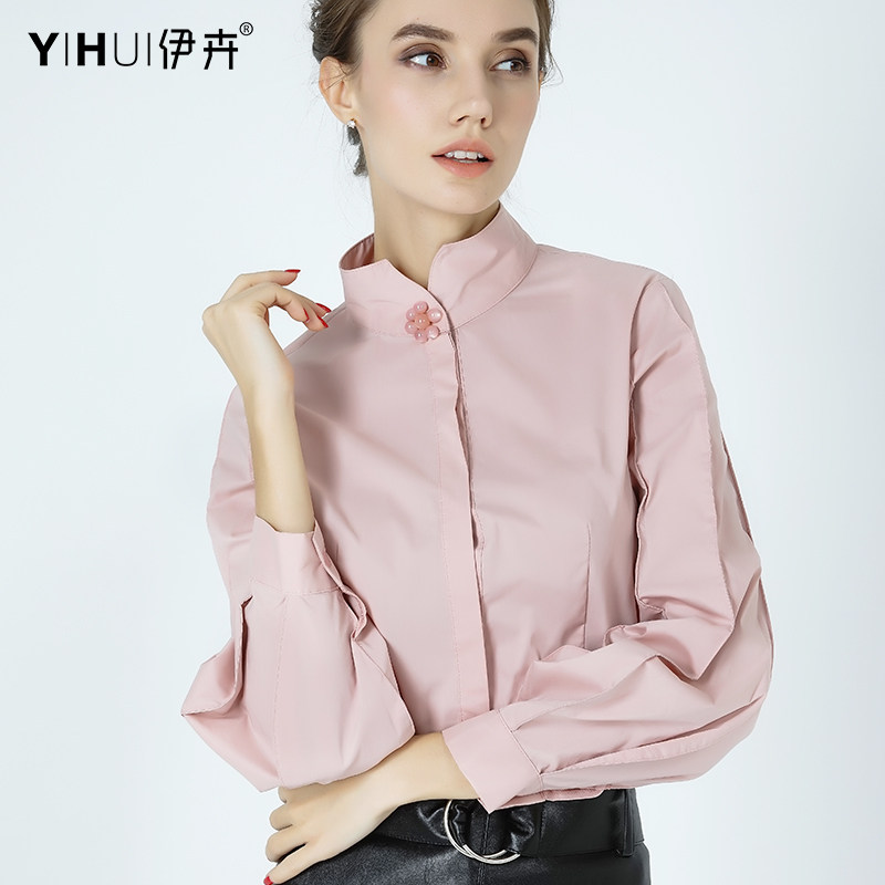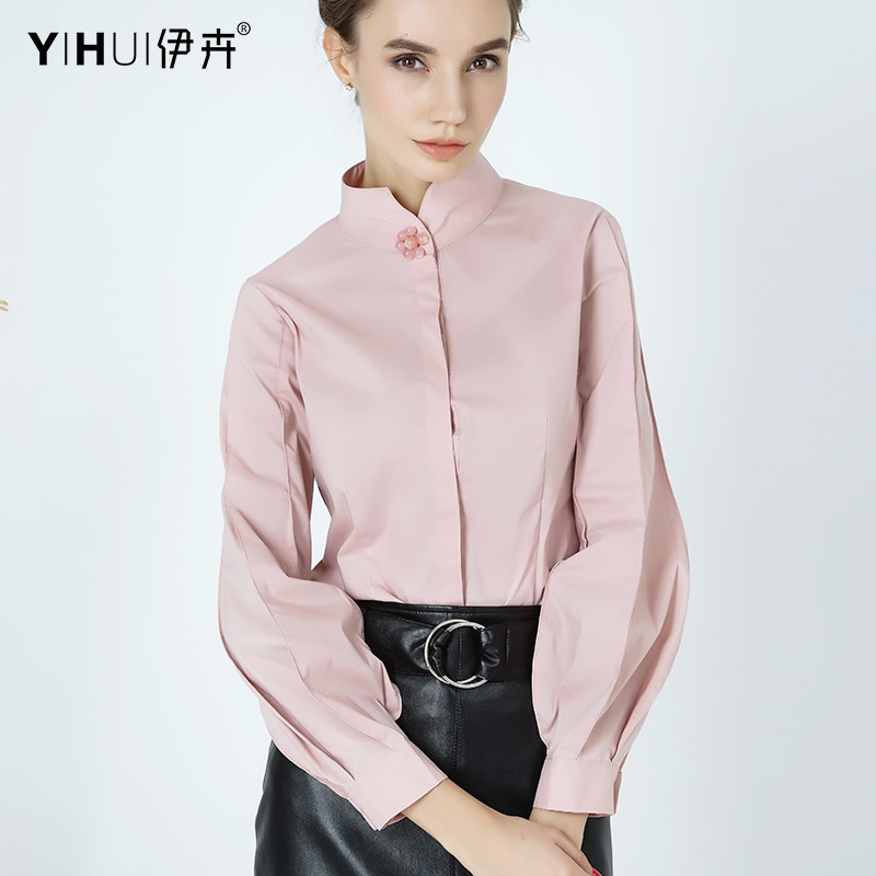 Pink shirt, blouse, large size, stand-up collar, thin, professional, small fragrance, commuter top, cotton, long-sleeved, Western style, ol autumn dress