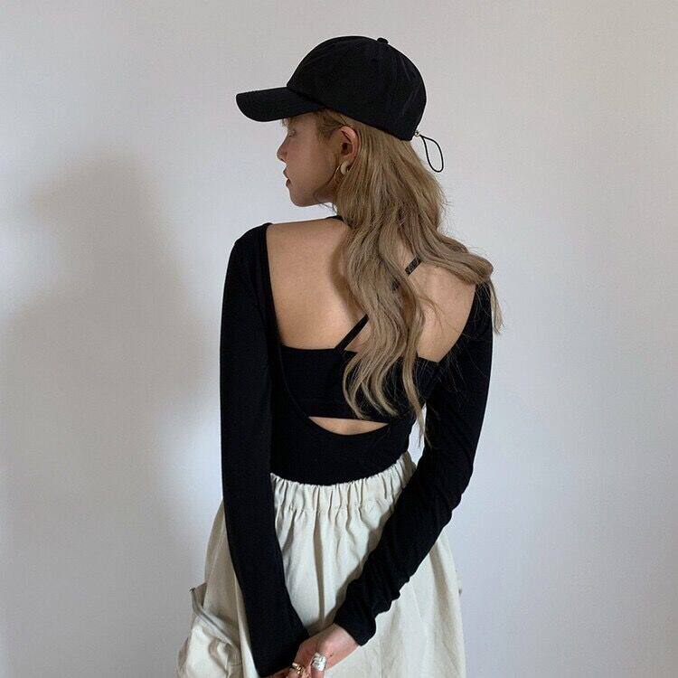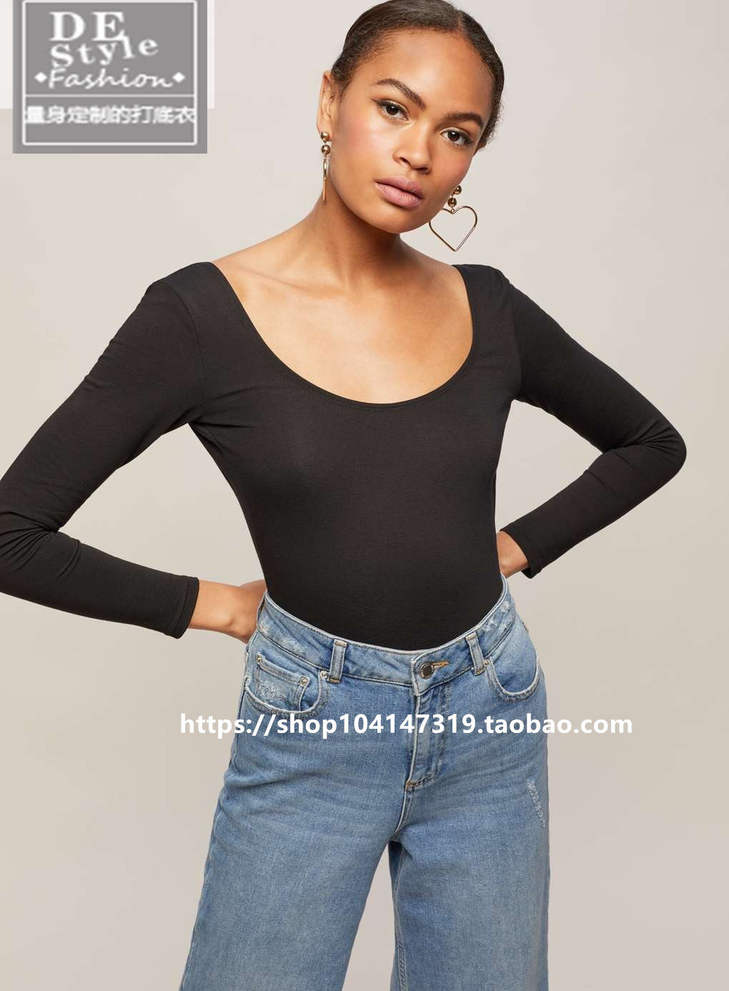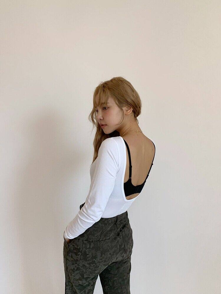 Ballet Dancing Leakage Back Practice Nude Color U Collar Long Sleeve Tight Fit Pure Cotton Big Size T-shirt Sexy to Wear Big Round Collar