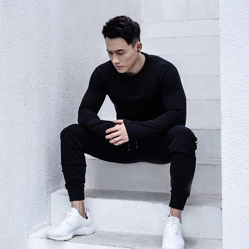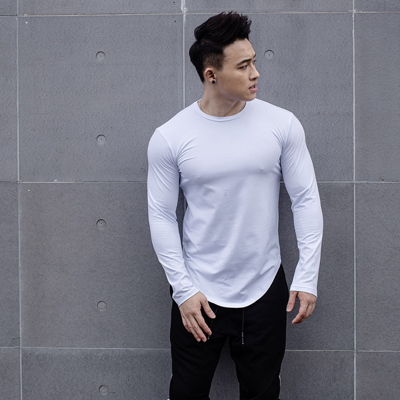 Pure color long sleeve sports T-shirt arc down swing round neckline body sweaters undershirt spring summer blouses training gym men