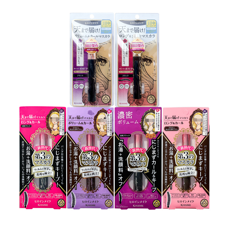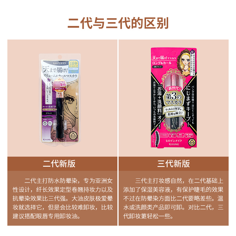 Three generations of pink box ciliary (brown) mascara three generations of light blue box thick (brown) mascara three generations of red box slim (black) mascara three generations of purple box dense (black) mascara second-generation red box fiber length (